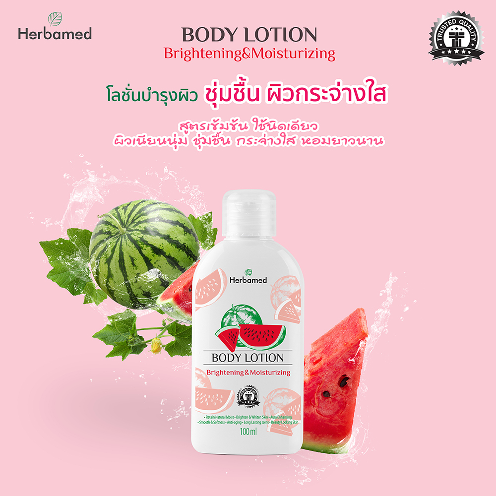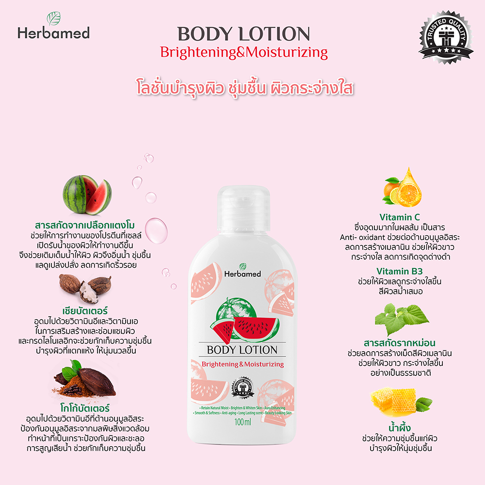 > ความงามและของใช้ใส่วนตัว > ผลิตภัณฑ์อาบน้ำและดู > ผลิตภัณฑ์บำรุงผิว > เฮอร์บาเมด ไบร์ทเทนนิ่ง แอนด์ มอยส์เจอร์ไรซิ่ง บอดี้ โลชั่น 100 มล.
